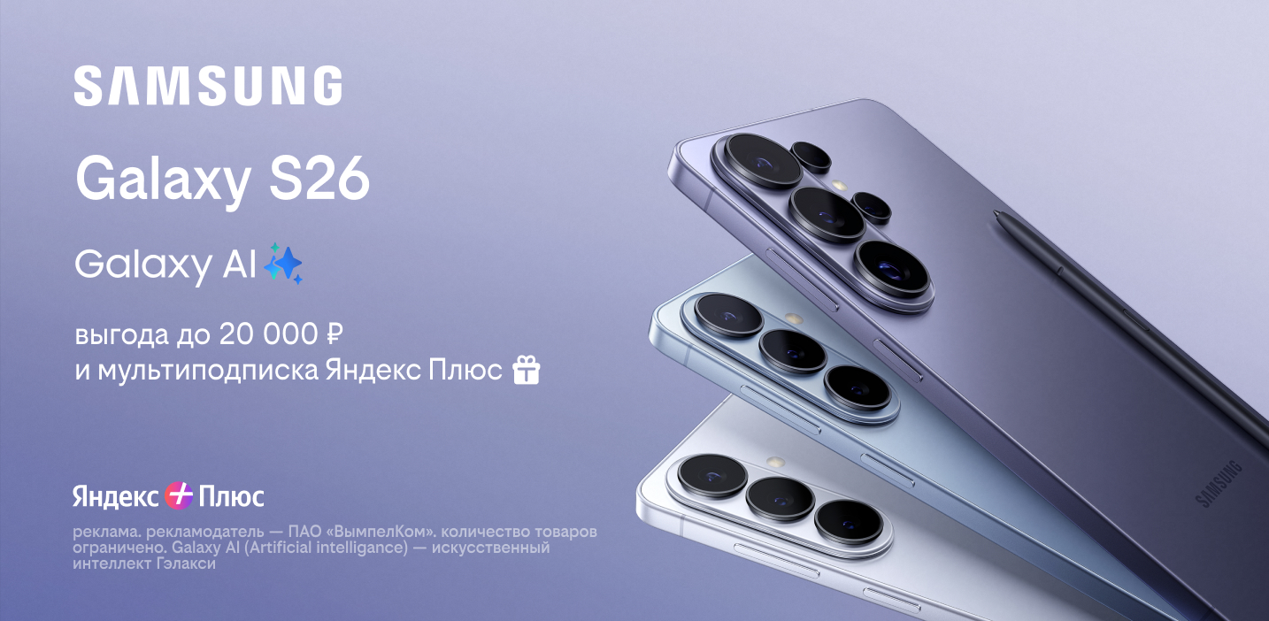 с 3 до 26 марта 2026 года в интернет-магазине и с 6 до 26 марта 2026 года в офисах продаж, покупая смартфоны Samsung Galaxy серии S26 с подпиской Яндекс Плюс, можно получить выгоду до 6990 рублей от розничной цены смартфона